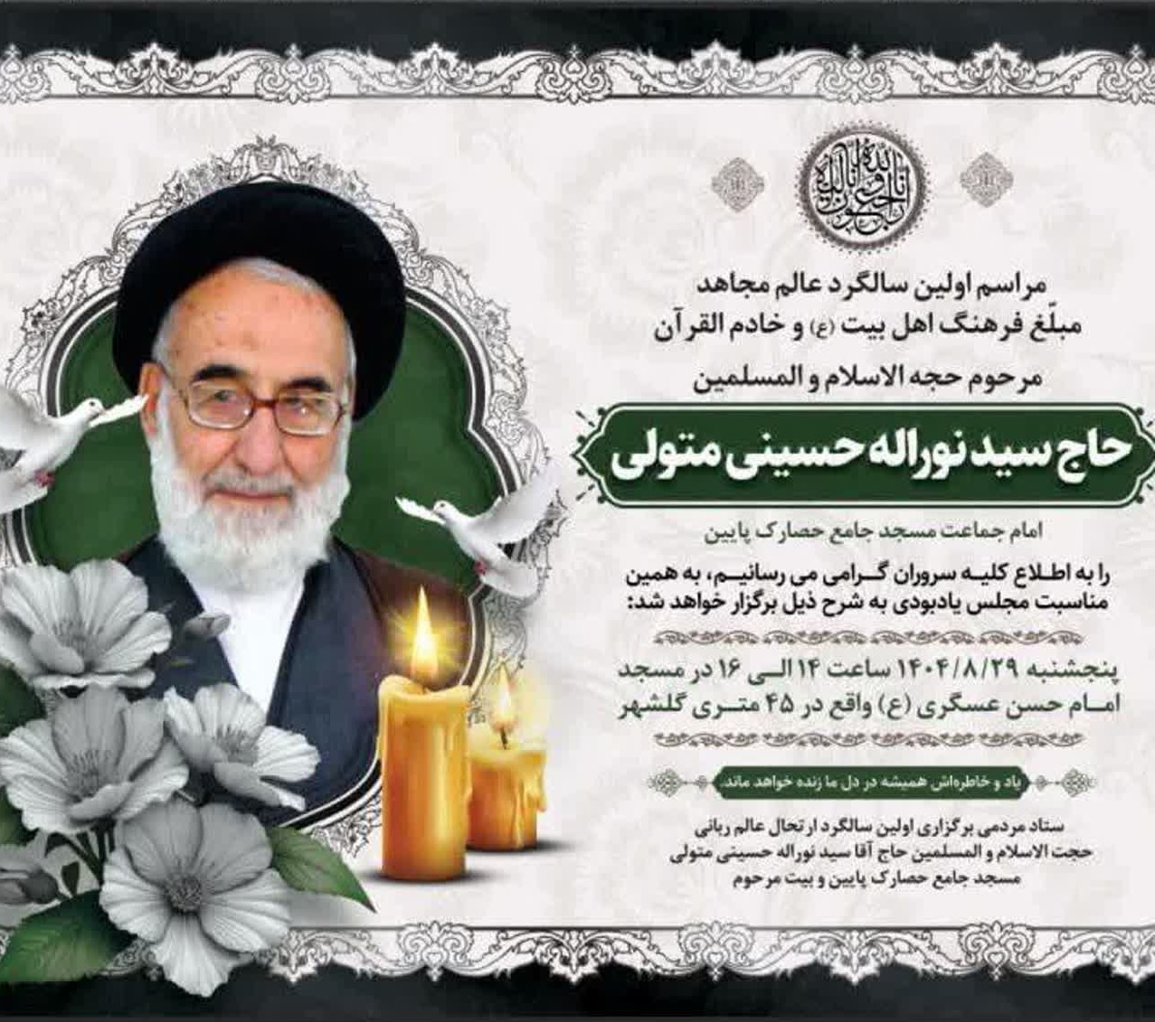 سالگرد در تاریخ 29 آبان سال 1404 از ساعت 14 تا 16 در مسجد امام حسن عسگری(ع) واقع در کرج، 45 متری گلشهر برگزار خواهد شد.